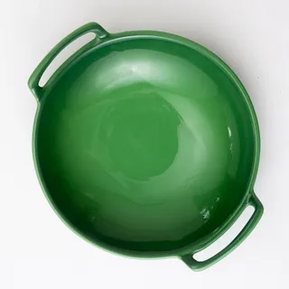 10" x 2.5"Le Creuset Green Wok Bowl with Handles - Shiny Ceramic Shallow Dish, Upscale, Hero Tableware. Austin Photography tabletop…